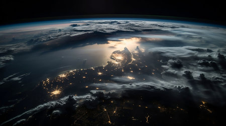 An AI generated illustration of a dazzling night-time landscape featuring the Earth's surface illuminated by a brilliant array of light sources