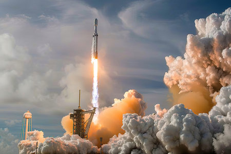 A powerful rocket lifts off from a launchpad, its engines firing with immense force, creating billows of smoke and fire. The launch tower stands nearby under a dramatic sky. This image captures the thrilling moment of a space mission launch, symbolizing power, ambition, and technological advancement.