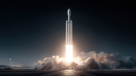 A stunning rocket launch scene showcasing powerful flames and thick smoke illuminating the night sky, symbolizing innovation and exploration.