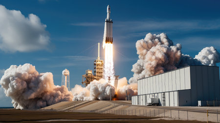 A rocket is launched into the sky with a plume of smoke and fire from a launchpad at Kennedy Space Center, A view of the SpaceX Rocket in liftoff, AI Generated