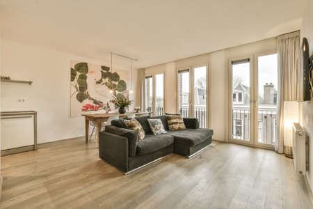 Couches and table located near dining area of spacious room in contemporary apartment