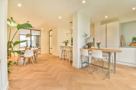 Contemporary minimalist style interior design of light studio apartment with wooden table and chairs in dining zone between open kitchen and living room with white walls and parquet floor