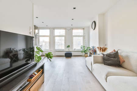 Interior of living room with comfortable sofa and TV against windows in contemporary apartment