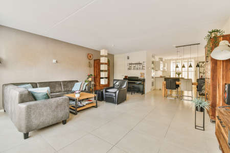 Stylish interior design of living room with elegant furniture and soft comfy couch