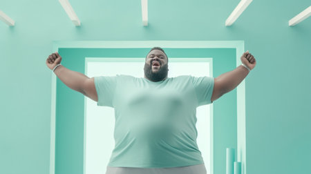 Southeast Asian man stretching while appearing relieved, showcasing a moment of comfort. Ideal for themes of relaxation, stretching, and wellness