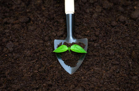 Young plant on soil over shovel.