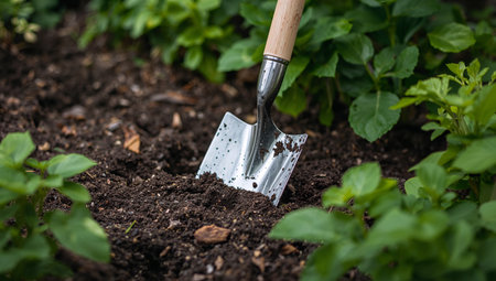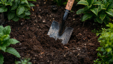 A close-up image of a garden spade inserted into rich brown soil, surrounded by lush green elements, showcasing the beauty of nature and gardening.