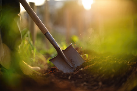 A shovel is positioned in dark soil surrounded by green plants. The gardener is preparing the garden bed for planting. Sunlight is present in the scene.