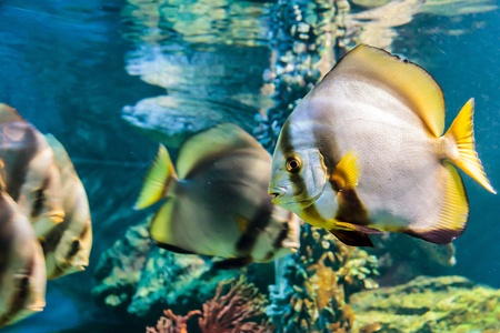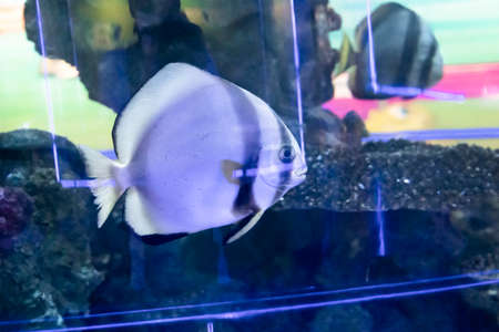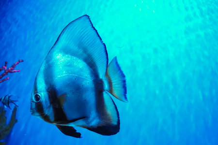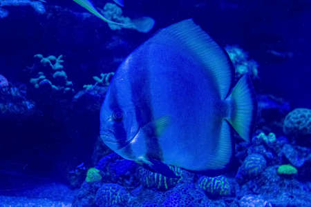 Beautiful bright fish Platax teira, Longfin Batfish in blue water of aquarium. Tropical fish on the background of aquatic coral reef in oceanarium pool. Underwater, ocean, marine life