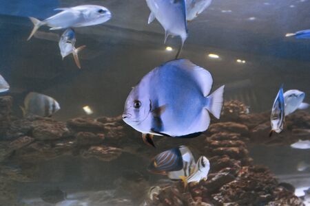 fish in aquarium oceanarium in blue depth water shoot from glass with noise.