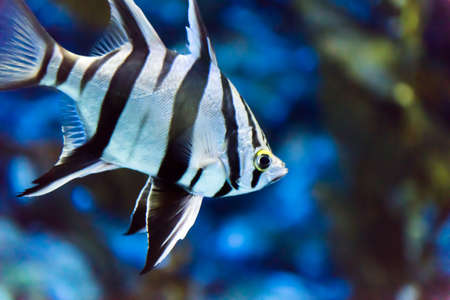 close up view of striped fish swimming under water in aquarium with blue lighting, panoramic shot