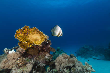 Spadefish and coral reef in the Red Sea.