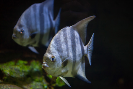 African moony (Monodactylus sebae) swimming in glass fish tank with green weed blurred background. It inhabits mangrove swamps and estuaries and can occasionally be found in lagoons.