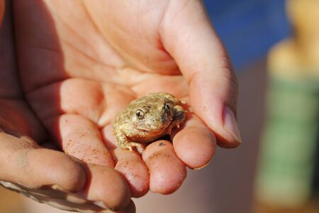 The frog sits on a palm of the person