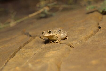 Close up of a Spade Foot Toad (Pelobates Cultripes) sitting on a rock with green leaves in the background and looking at the camera