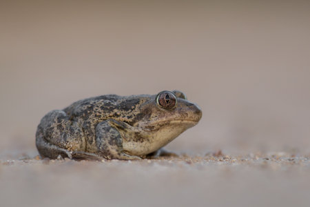 Eastern spadefoot toad (Pelobates syriacus) lying on the sand. Isolated on light background