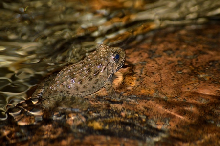 big eyes of frog Telmatobius simonsi an endemic amphibian species of Bolivia. A macro portrait of an endangered species and protected animal.