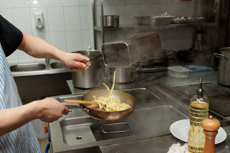 Chef is cooking pasta in professional kitchen
