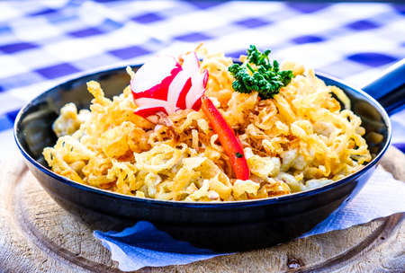 Spaezle, typical Bavarian plate of homemade pasta and cheese with fried onions on top served at open air restaurants (beer gardens)