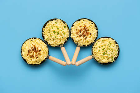 German spaetzle in small pans aligned on a blue table view from above. German noodles with cheese, topped with chives and roasted onion.