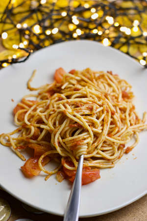 Italian tasty pasta with tomatoes on a fork. Christmas food concept.
