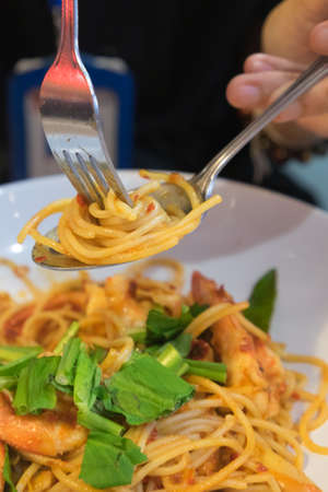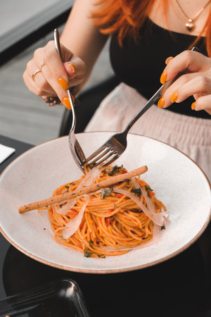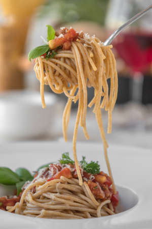 Eating Spaghetti Beef Sauce in Restaurant at Night.Selective Focus