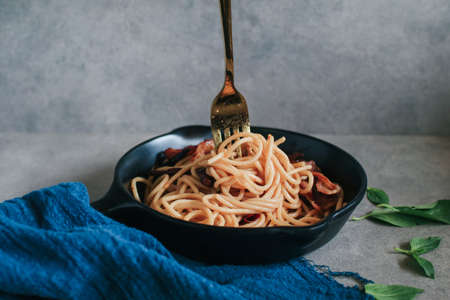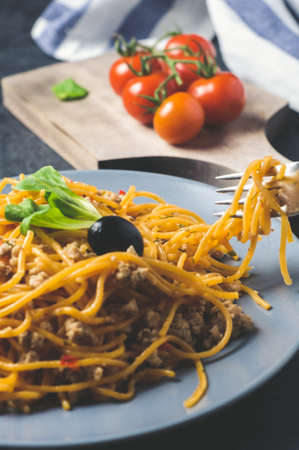 Classic spaghetti bolognese with cream and tomato sauce on fork and black plate on light background. Eating spaghetti requires fork.