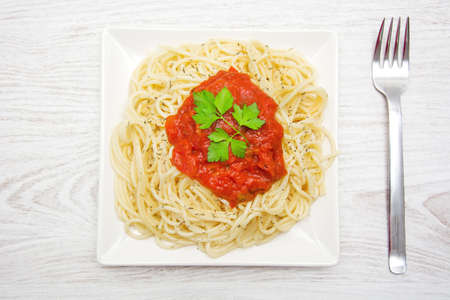 Top plan of a plate of Spaghetti with tomato, pasta wrapped around the fork