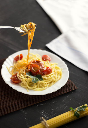 Ready spaghetti with tomatoes on a plate. Cook. Food ingredients