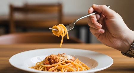 A close-up of a hand holding a fork with twirled spaghetti covered in red sauce. A plate of pasta sits in the background, capturing a delicious dining moment.