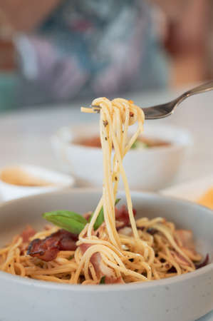 Hand holding fork wrapped on delicious spaghetti with basil, bacon, sauces, green pepper, Hot chili and vegetables.