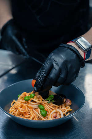 detail male hand eating pasta spaghetti with clams and mullet, Mediterranean food