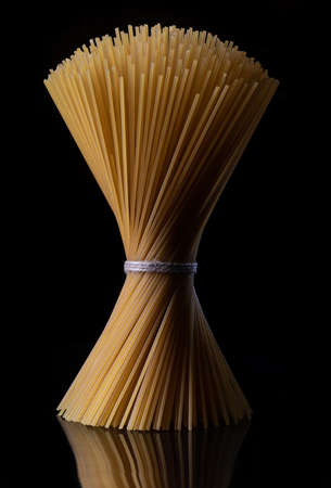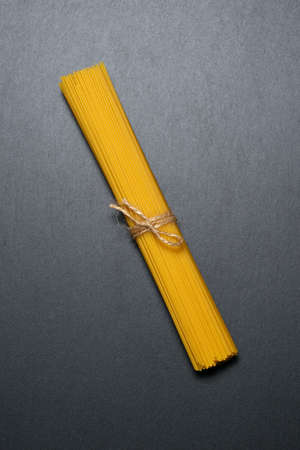 Dry pasta spaghetti, bandaged with ribbon, on black background with copy space