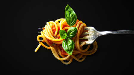 Appetizing spaghetti rolled on fork with basil. Delicious pasta restaurant concept. Black background. Generative AI.