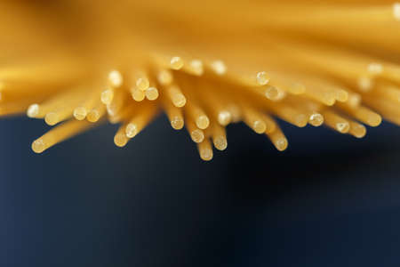 Bunch of uncooked Italian pasta spaghetti on a blue background. Macro shot, selective focus