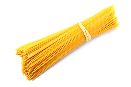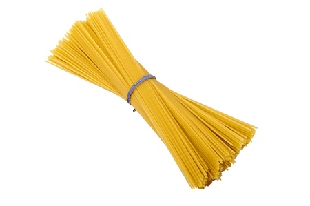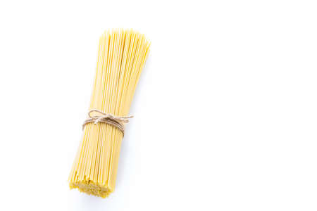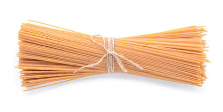A vertical bunch and a bunch of raw spaghetti tied with string. Bundle on a white background. View from above. Italian food concept.