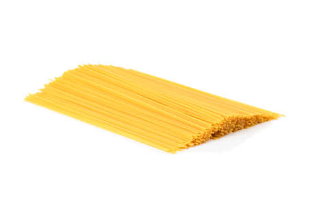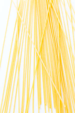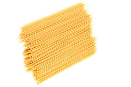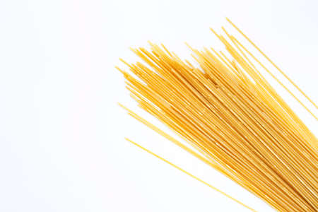 Italian food concept, bunch of raw long pasta, spaghetti, on white background. Top view design with copy space.