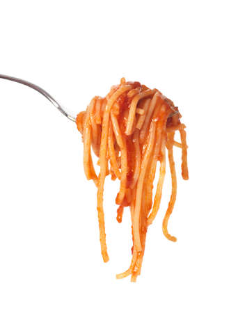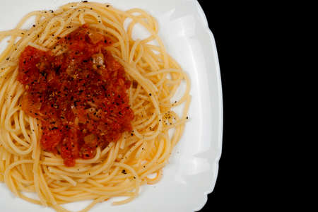 Spaghetti with tomato sauce on white plate, closeup, top view, abstract, texture, on white background