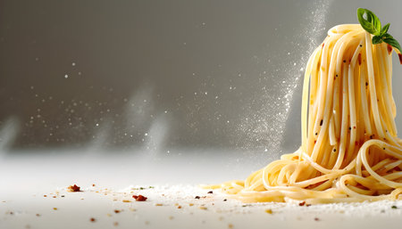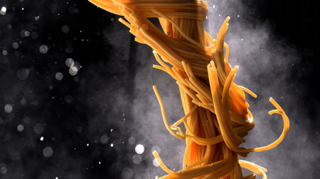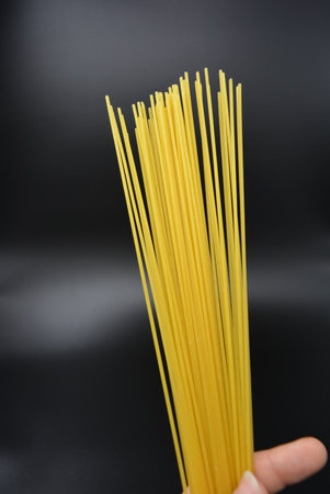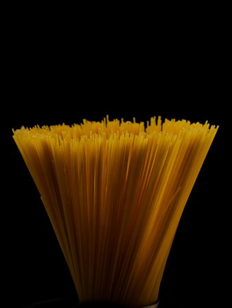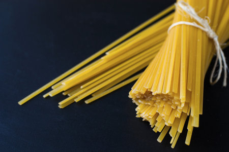 Spaghetti on black background. Selective focus. Shallow depth of field. Food, store food, pasta. Italian long pasta made from durum wheat is set against a black matte background.