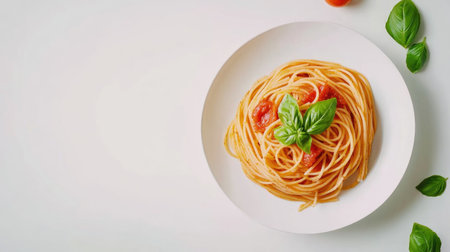 A beautifully arranged plate of spaghetti topped with fresh basil leaves and a rich tomato sauce, perfect for any Italian meal or culinary creation.