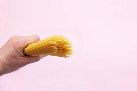 Hand holds raw spaghetti. Isolated on pink background. Pasta. Selective focus