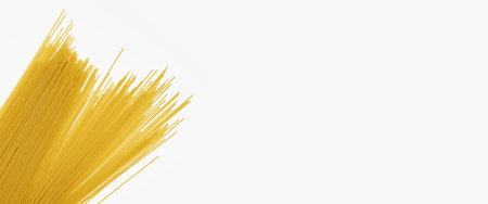Raw long spaghetti on a white background. Top view, flat lay. Banner