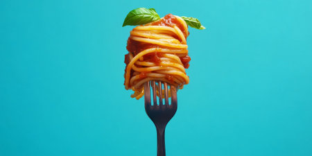 Twirling spaghetti on a fork with rich tomato sauce and basil, close-up against a bold blue background, giving a fresh and modern feel