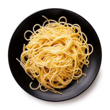 Spaghetti pasta in black bowl isolated on white background. Top view.