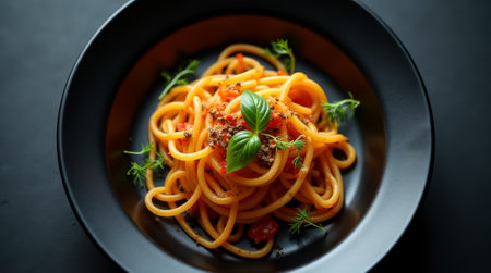 A generously serving of spaghetti is topped with rich tomato sauce and fresh basil, elegantly placed on a dark plate with herbs enhancing the presentation.