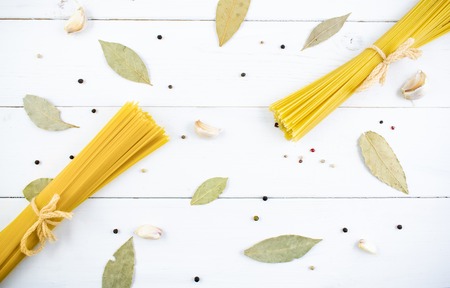 Bunch of long dry spaghetti on a white wooden table. Italian cuisine concept, food ingredients. Flat lay. Top view.