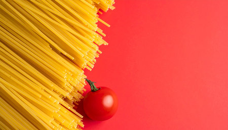 A vibrant pile of uncooked spaghetti pasta is arranged on the left side of a bright red background, with a single red cherry tomato.