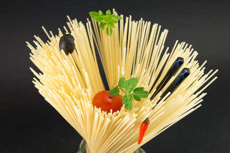 Raw spaghetti with tomato and olives placed in spiral shape ready for cooking