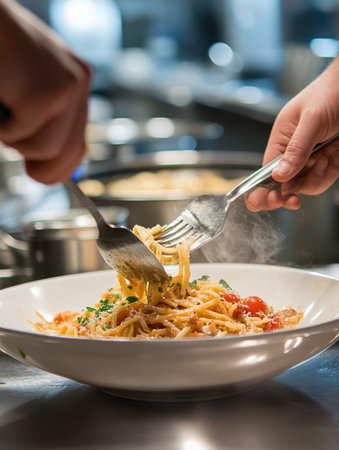 Chef preparing a pasta dish in traditional Italian restaurant kitchen - ai