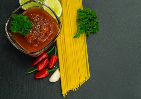 Top view of ingredients of delicious classic Italian spaghetti pasta with tomato sauce, and copy space on black background